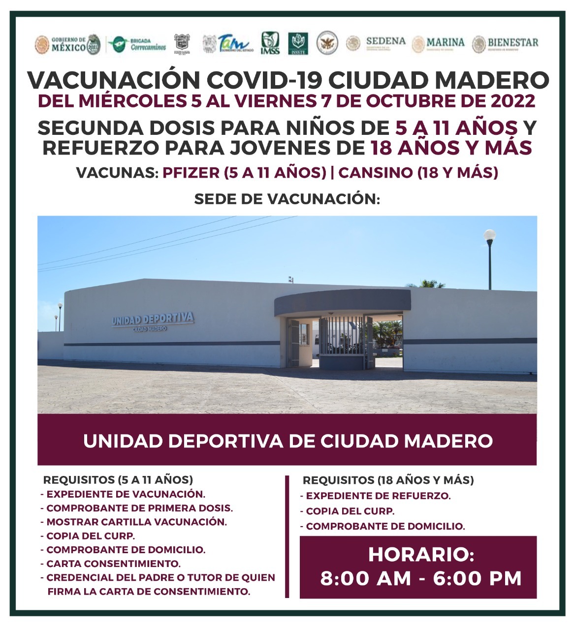 Ciudad Madero, Tamaulipas. - En seguimiento a la estrategia de vacunación para la prevención de Covid-19, el Gobierno de Ciudad Madero, a través de la Dirección de Municipio Saludable, informó que este miércoles y hasta el viernes 7 de octubre se llevará a cabo la jornada de inmunización para niños de 5 a 11 años y el refuerzo para jóvenes de 18 años y más.
