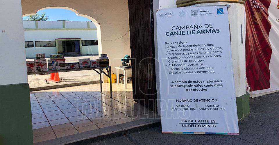 Matamoros, Tamaulipas. - El programa de Canje de Armas que tiene de manera coordinada la Secretaría de la Defensa Nacional (Sedena) y el municipio de Matamoros no ha tenido los resultados que se esperaba, son pocas las personas que han acudido a realizar la entrega de este tipo de artículos a cambio de electrodomésticos.