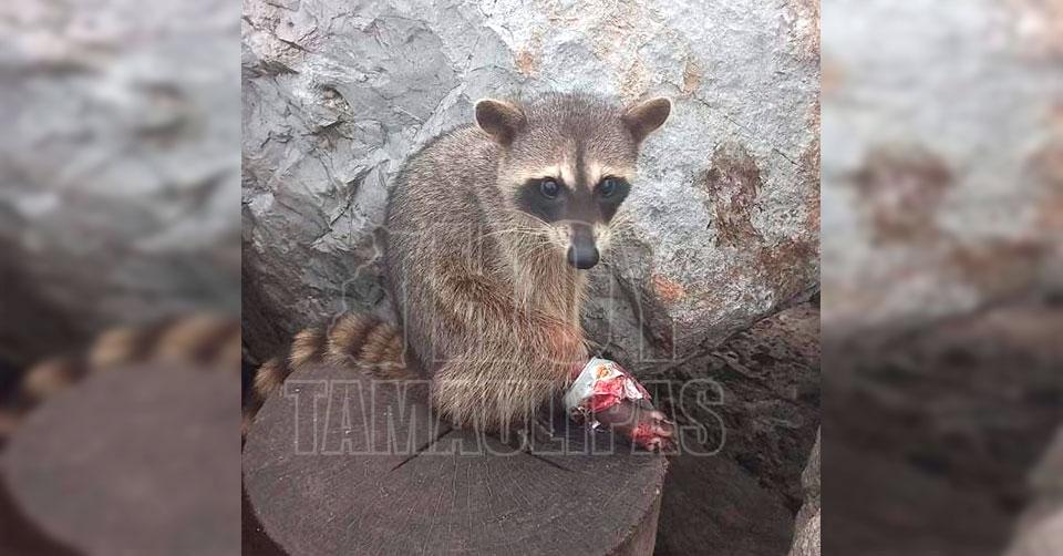 Ciudad Madero, Tamaulipas. - Un mapache de la escollera de Playa Miramar terminó herido de una de sus patitas, al quedar atorado en un pedazo de lata de cerveza.