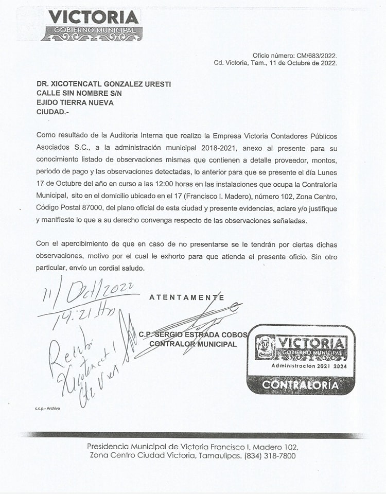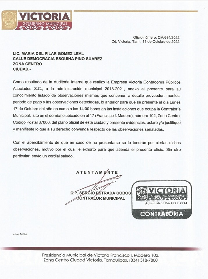 Ciudad Victoria, Tamaulipas.- La Contraloría del gobierno de Ciudad Victoria a cargo de Sergio Estrada Cobos, giró citatorios para que acudan a comparecer y aclaren faltantes por 140 millones de pesos a los ex alcaldes Xicoténcatl González Uresti y Pilar Gómez Leal.