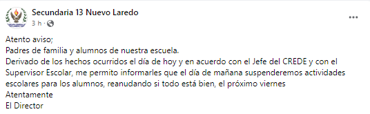 A través de la página de Facebook de la Secundaria, la directiva subrayó: “Atento aviso; Padres de familia y alumnos de nuestra escuela. Derivado de los hechos ocurridos el día de hoy y en acuerdo con el Jefe del CREDE y con el Supervisor Escolar, me permito informarles que el día de mañana suspenderemos actividades escolares para los alumnos, reanudando si todo está bien, el próximo viernes. Atentamente El Director”.