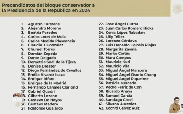 Ciudad Victoria, Tamaulipas. – El presidente Andrés Manuel López Obrador, presentó esta mañana una lista de 42 posibles precandidatos o aspirantes de la oposición a la Presidencia de la República en 2024.