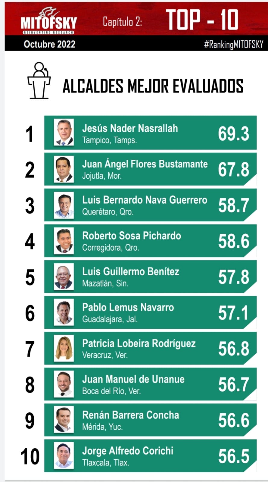 La lista de los primeros diez ediles mejor calificados se complementa con los representantes de las ciudades de; Corregidora, Querétaro; Mazatlán, Sinaloa; Guadalajara, Jalisco; Veracruz puerto; Boca del Río, Veracruz; Mérida, Yucatán; y Tlaxcala Capital.