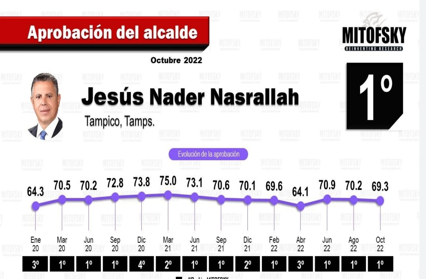 Tampico, Tamaulipas. - Con un nivel de aprobación superior a la de todos los Alcaldes de México, el Presidente municipal Chucho Nader obtuvo nuevamente el primer lugar en la encuesta nacional realizada por la Empresa Mitofsky correspondiente al mes de octubre.
