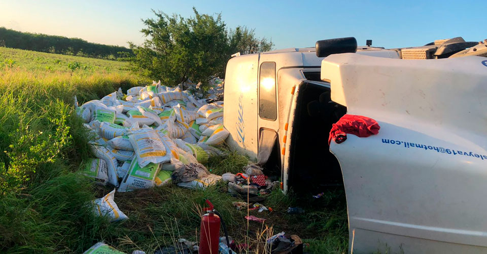 El tracto camión quedó volcado a un costado de la carretera junto a dos contenedores que transportaba varias toneladas de fertilizante.