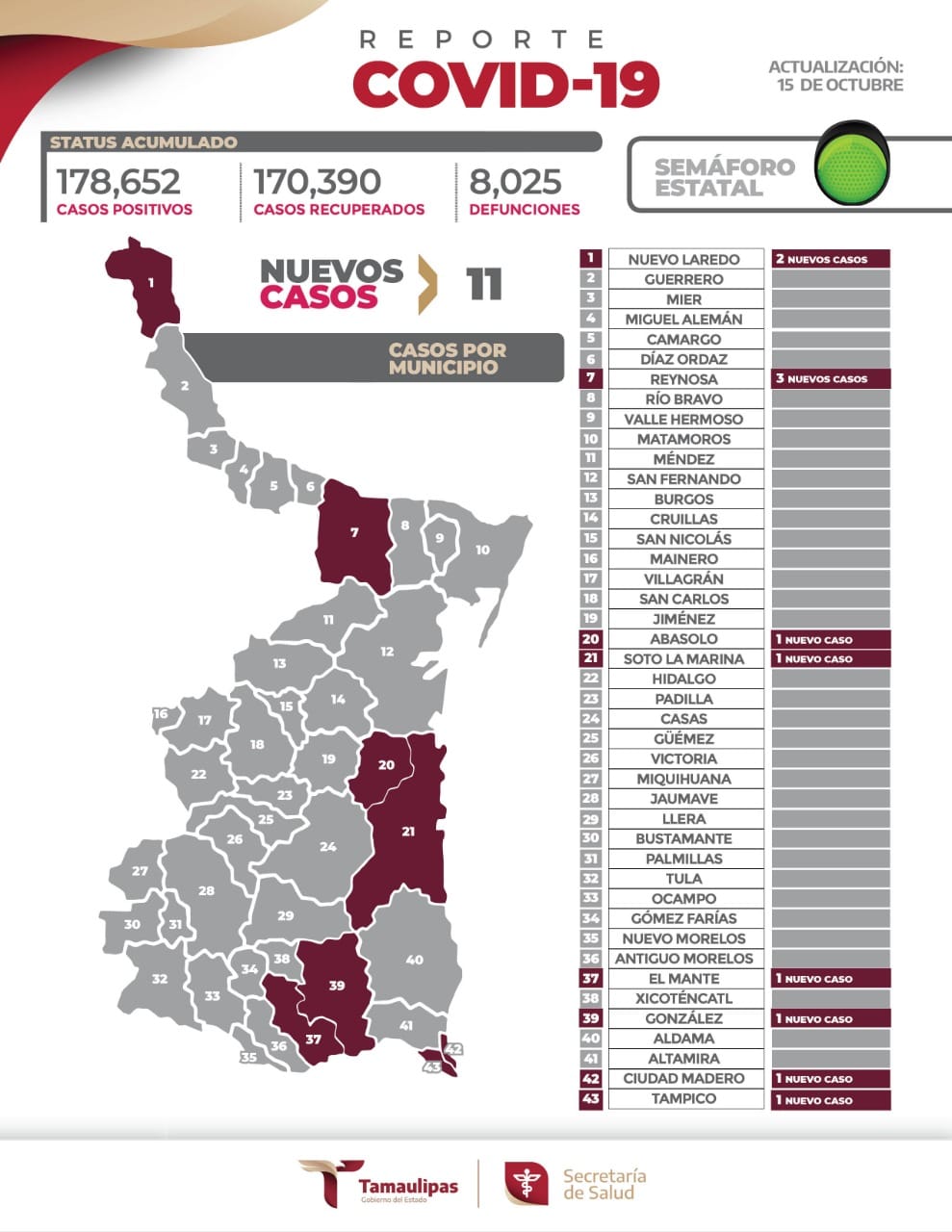 Ciudad Victoria, Tamaulipas. – Un total de 11 nuevos contagios de Covid-19 sin ninguna muerte por complicaciones graves de la enfermedad se reportaron este día en Tamaulipas, informó la Secretaría de Salud del Estado.