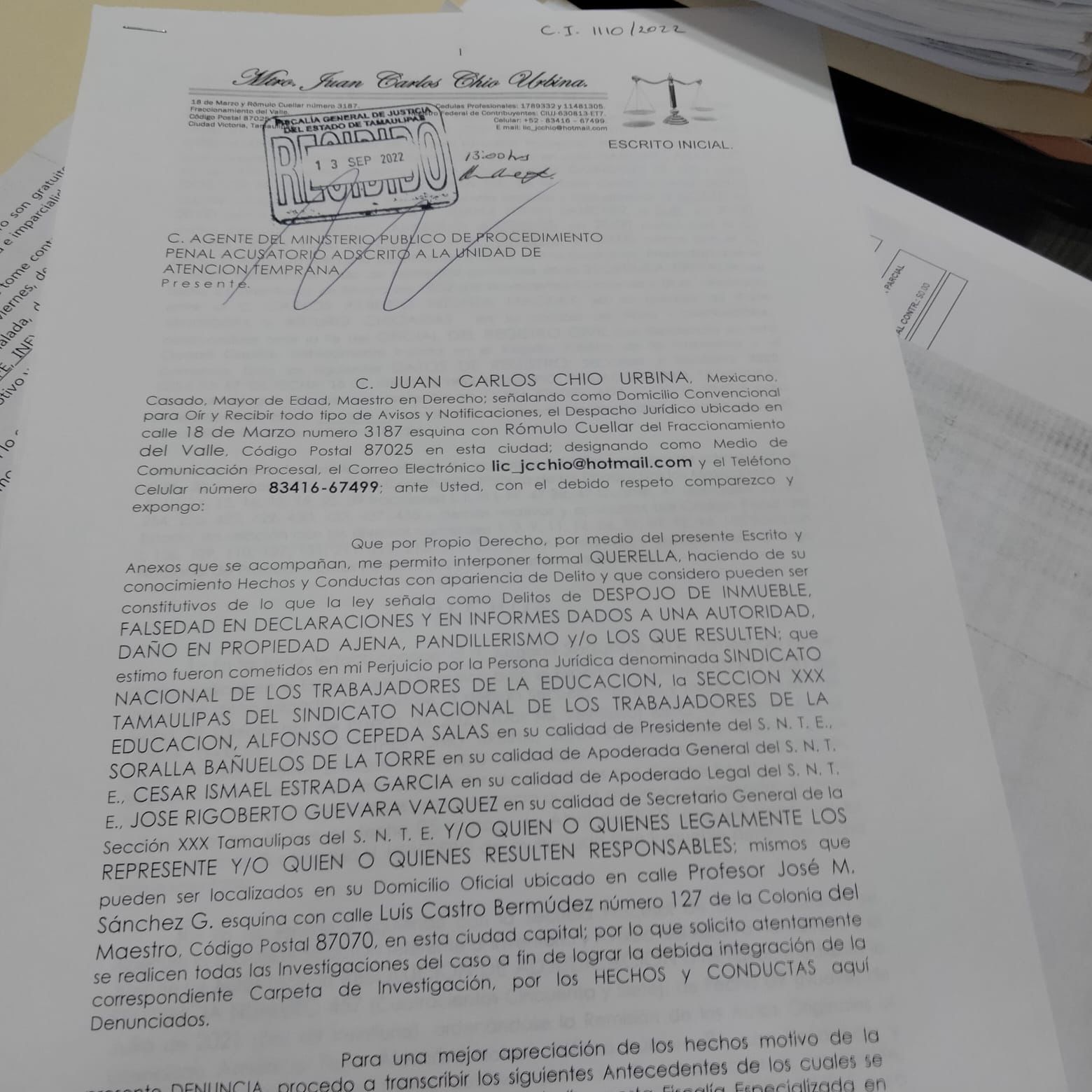 Ciudad Victoria, Tamaulipas. - El abogado Juan Carlos Chío Urbina, denunció por la vía civil y penal al Sindicato Nacional de Trabajadores de la Educación (SNTE) que dirige a nivel nacional Alfonso Cepeda Salas, por el robo y despojo de una propiedad ubicada en el 15 y 16 Abasolo en Victoria.