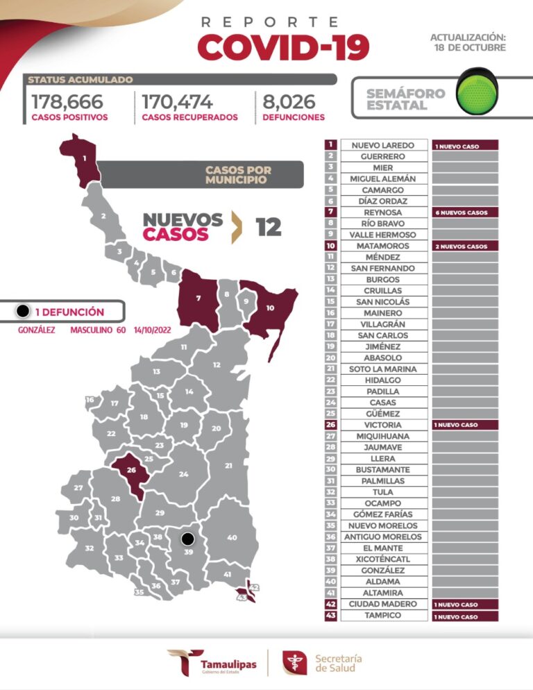 A la fecha, solo hay dos municipios en semáforo amarillo, Reynosa y Ciudad Mante, mientras que el resto de la entidad permanece en verde.