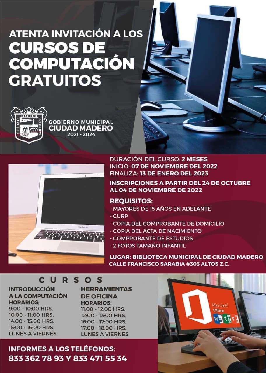 Ciudad Madero, Tamaulipas. - El Gobierno de Ciudad Madero, a través de la Dirección de Educación, invita a la población a participar en los distintos cursos de computación gratuitos que se impartirán a partir del 7 de noviembre al 13 de enero en la Biblioteca Benito Juárez.