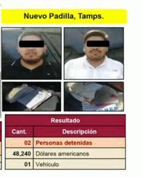 “También en el caso de Padilla, Nueva Padilla en Tamaulipas fueron aseguradas dos personas con dinero, dólares que no pudieron acreditar su legal procedencia”, expuso.