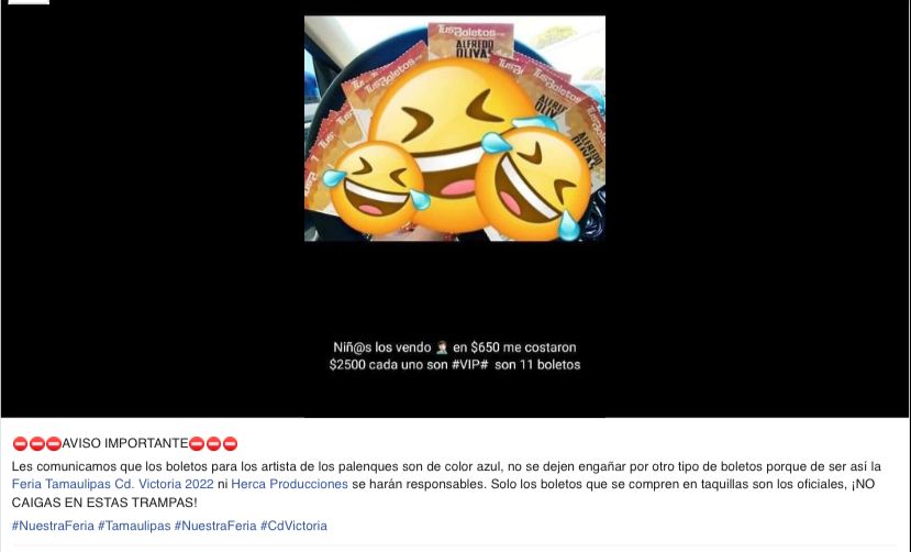 “Les comunicamos que los boletos para los artistas de los palenques son de color azul, no se dejen engañar por otro tipo de boletos, porque de ser así la Feria Tamaulipas Cd. Victoria 2022 ni Herca Producciones se harán responsables. Solo los boletos que se compren en taquillas son los oficiales, ¡NO CAIGAS EN ESTAS TRAMPAS!”, postearon en la página.