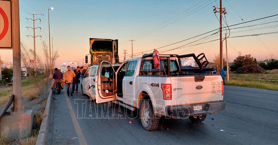 Reynosa, Tamaulipas. - Una mujer y su hijo resultaron lesionados esta mañana luego de que la camioneta en la que viajaba participó en un choque múltiple, en el Libramiento Monterrey-Matamoros, a unos metros del entronque con la carretera a Matamoros, a la altura de la colonia José López Portillo.