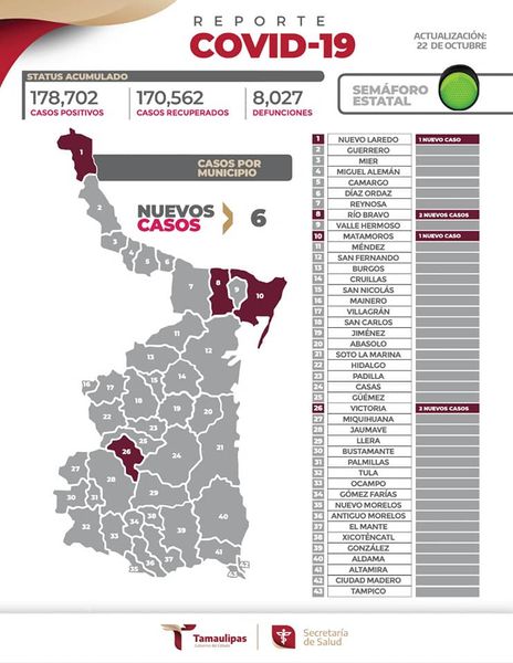 Ciudad Victoria, Tamaulipas. - Un total de seis nuevos contagios de Covid-19, sin muertes por complicaciones graves de la enfermedad, se registraron este sábado en Tamaulipas, informó la Secretaría de Salud del Estado.