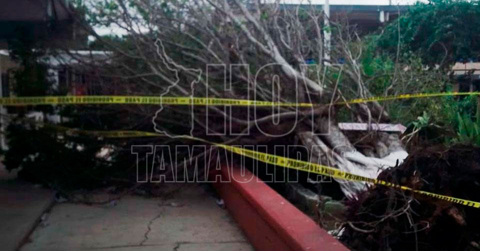 Ciudad Madero, Tamaulipas. - Tres árboles que se encontraban en los patios de una Escuela Secundaria de Madero fueron derribados por los vientos del norte que trajo consigo el frente frío.