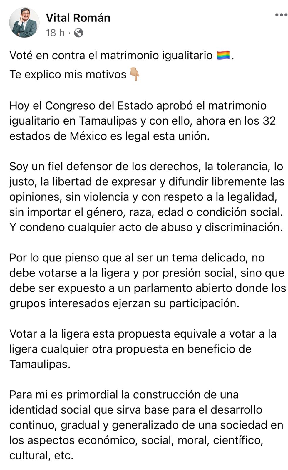 Ciudad Victoria, Tamaulipas. – El día de ayer Tamaulipas se convirtió en el último Estado de México en aprobar el matrimonio igualitario, esto tras ser votado en el Congreso Estatal, sin embargo, no todos los diputados dieron su voto a favor, entre ellos Vital Román.
