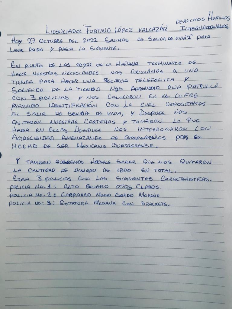 El presidente de la Asociación Internacional de Derechos Humanos, Fortino López Balcázar, informó que recibió una carta escrita a mano de migrantes que, por temor a sufrir represalias, no quisieron identificarse, pero que denunciaron a tres elementos de la Policía Estatal de haberlos despojado del poco dinero que traían.