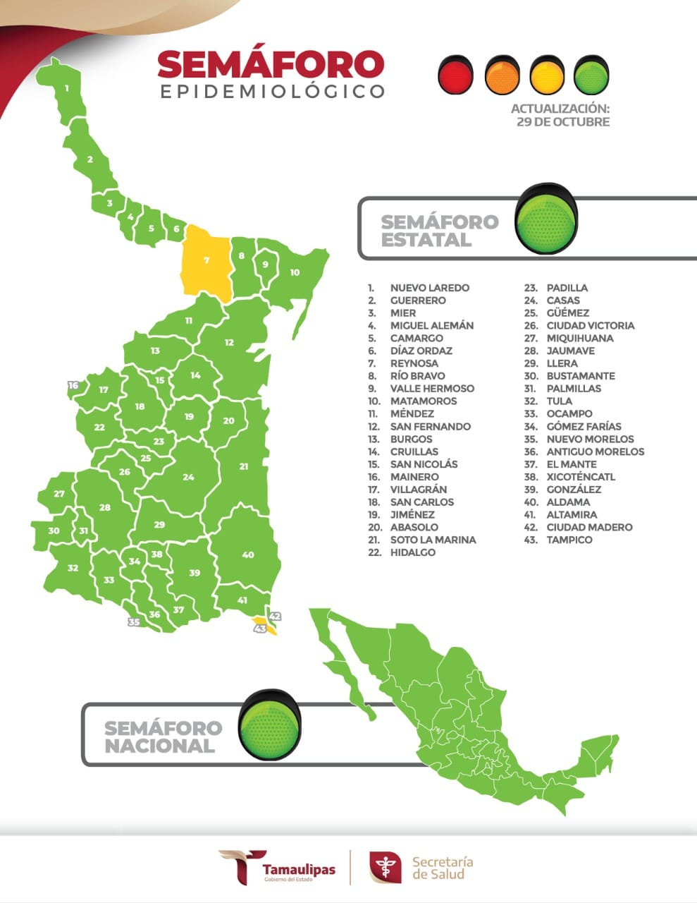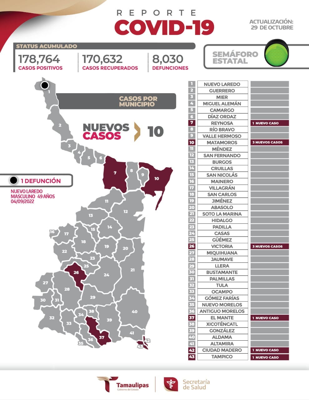 Mientras que el fallecimiento se reportó en el municipio de Nuevo Laredo, siendo un hombre de 49 años quien perdió la vida.