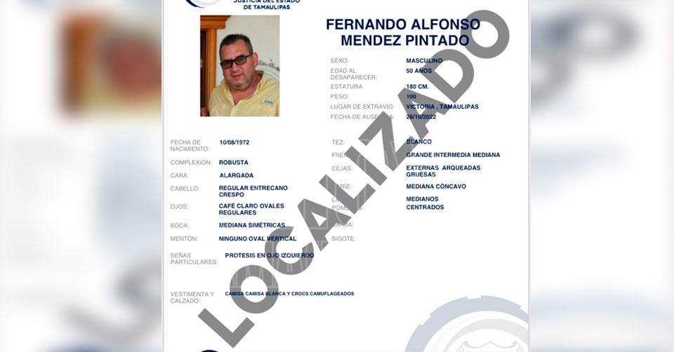 Ciudad Victoria, Tamaulipas. – La Fiscalía General de Justicia de Tamaulipas (FGJT) emitió un boletín de búsqueda de Fernando Alfonso Méndez Pintado, quien despareció en Ciudad Victoria.