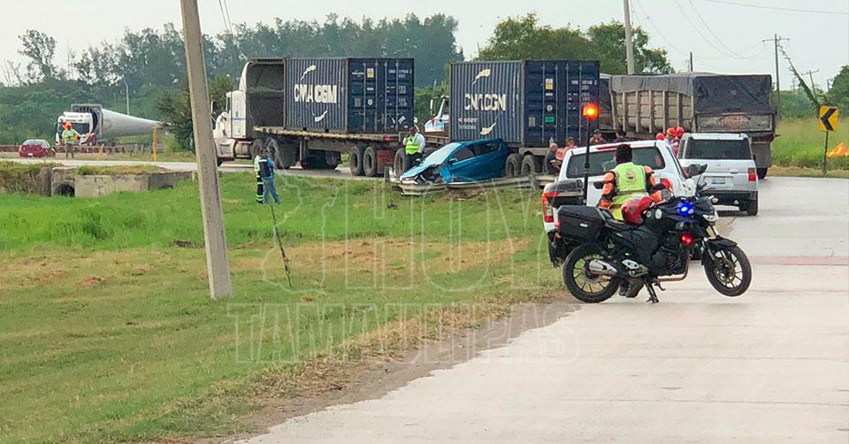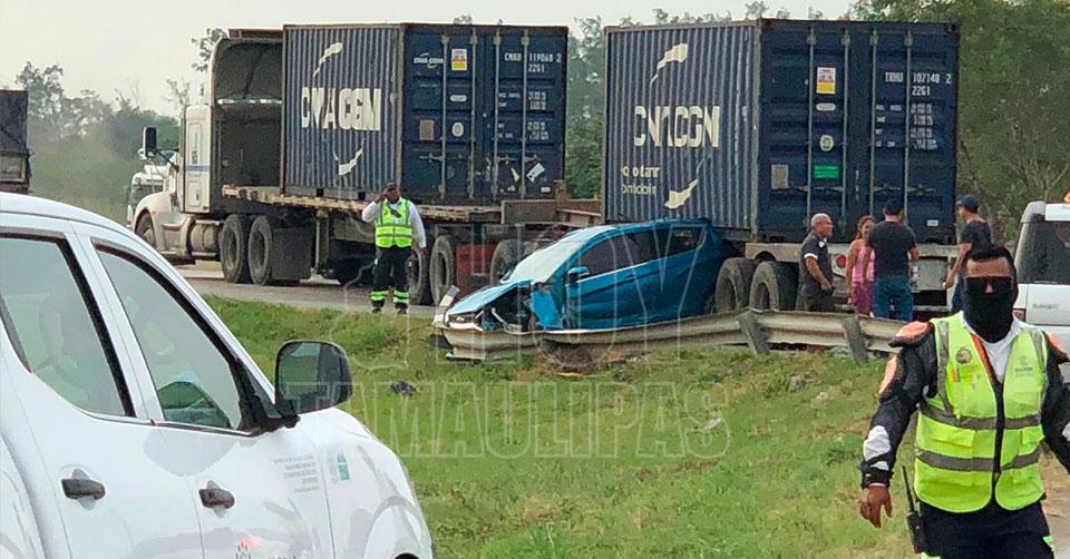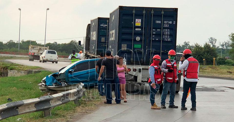 Tráiler impacta a un auto y lo proyecta contra un barandal de contención en Altamira