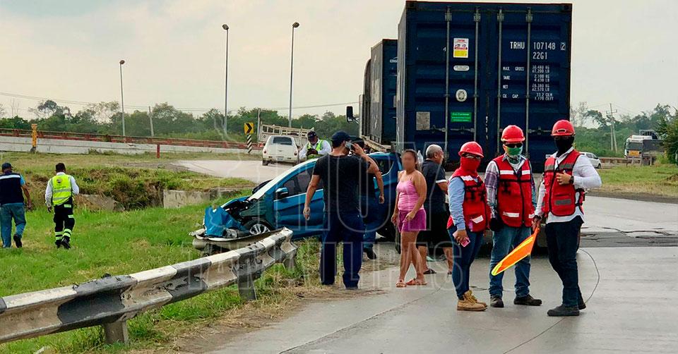 Altamira, Tamaulipas. - El choque entre un tráiler y un automóvil que salió proyectando contra un barandal metálico de contención, provocó el cierre durante más de una hora de un tramo de la carretera Tampico-Mante, a la altura del puente roto en Altamira.