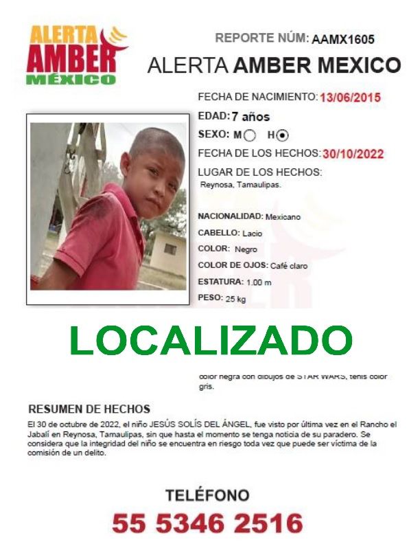 Reynosa, Tamaulipas. - El pequeño Jesús Solís del Ángel, de tan solo siete años de edad, fue localizado con vida el día de ayer; se había activado la Alerta Amber desde el pasado 30 de octubre.