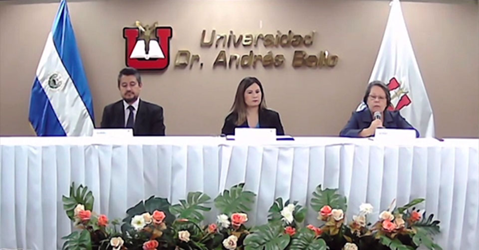 Desde la sede de la UNAB en El Salvador, la rectora Ana Iveth Escobar de Umanzor estuvo acompañada por la Mtra. Miriam Gladis de Marroquín, Decana de la Facultad de Enfermería de la institución salvadoreña, entre otras autoridades.