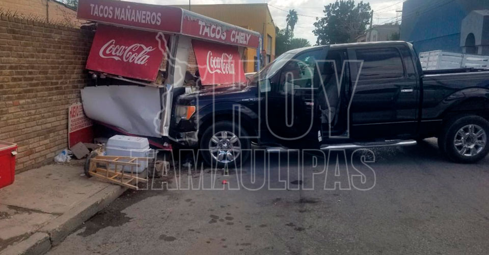 Nuevo Laredo, Tamaulipas. - Una mujer resultó lesionada luego de que el puesto de tacos que atendía, fue chocado por una camioneta, cuyo chofer fue impactado por una segunda unidad.