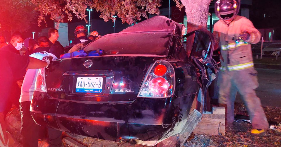 Reynosa, Tamaulipas. - Un conductor y su acompañante quedaron atrapados en el vehículo en el que andaban de parranda en Reynosa, luego de que este se proyectara contra un árbol al quedarse sin control presuntamente por el exceso de velocidad.