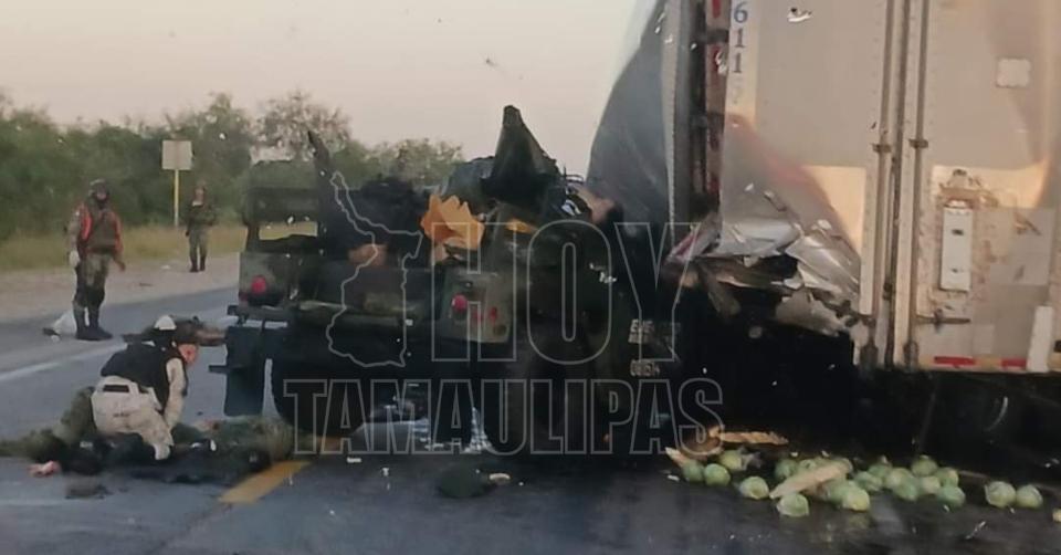 Soto La Marina, Tamaulipas. - Al menos siete militares perdieron la vida esta madrugada y uno más resultó lesionado tras estrellarse la unidad Humvee en la que viajaban contra la caja de un tráiler.