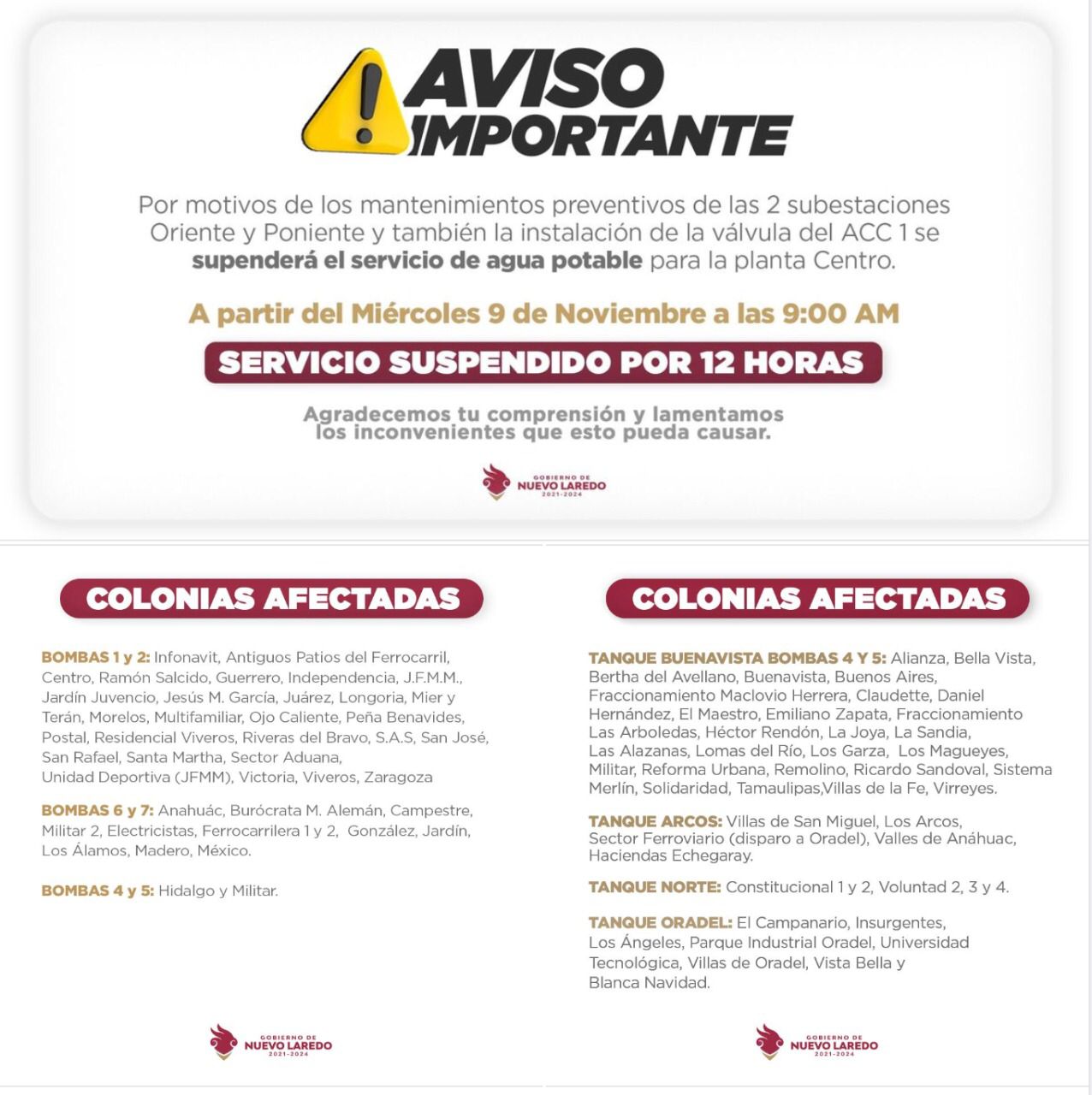 Las colonias que son alimentadas por planta Centro y que se quedarán sin servicio son: Infonavit, Antiguos Patios del Ferrocarril, Cenbtro, Ramón Salcido, Guerrero, Independencia, J.F.M.M., Jardín Juvencio, Jesús M. García, Juárez, Longoria, Mier y Terán, Morelos, Multifamiliar, Ojo Caliente, Peña Benavides, Postal, Residencial Viveros, Riveras del Bravo, S.A.S, San José, San Rafael, Santa Martha, Sector Aduana, Unidad Deportiva (JFMM), Victoria, Viveros, Zaragoza, Anahuác, Burócrata M. Alemán, Campestre, Militar 2, Electricistas, Ferrocarrilera 1 y 2, González, Jardín, Los Álamos, Madero, México, Hidalgo y Militar, 20 de Noviembre, Américo Villarreal, Altavista, C.N.O.P., Hacienda J. Longoria, Hidalgo, Hipodrómo, La Fe 1 y 2 sección, La Rosita, Las Torres, Loma Bonita, Lomas del Poniente, Luis Donaldo Colosio, Matamoros, Mirador, Nueva Era, Palacios, Parque Industrial Nuevo Laredo, Roma, Unidad Nacional y Zona, Sector Centro, Alianza, Bella Vista, Bertha del Avellano, Buenavista, Buenos Aires, Fraccionamiento Maclovio Herrera, Claudette, Daniel Hernández, El Maestro, Emiliano Zapata, Fraccionamiento Las Arboledas, Héctor Rendón, La Joya, La Sandia, Las Alazanas, Lomas del Río, Los Garza, Los Magueyes, Militar, Reforma Urbana, Remolino, Ricardo Sandoval, Sistema Merlín, Solidaridad, Tamaulipas, Villas de la Fe, Virreyes, Villas de San Miguel, Los Arcos, Sector Ferroviario (disparo a Oradel), Valles de Anáhuac, Haciendas Echegaray, Constitucional 1 y 2, Voluntas 2, 3 y 4, El Campanario, Insurgentes, Los Ángeles, Parque Industrial Oradel, Universidad Tecnológica, Villas de Oradel, Vista Bella y Blanca Navidad.