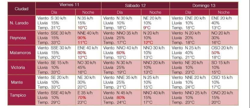 Ciudad Victoria, Tamaulipas. - El ingreso del Frente Frió Número ocho, provocará una ligera disminución en las temperaturas, estará acompañado de viento moderado de dirección norte y lluvia ligera puntual durante su ingreso.