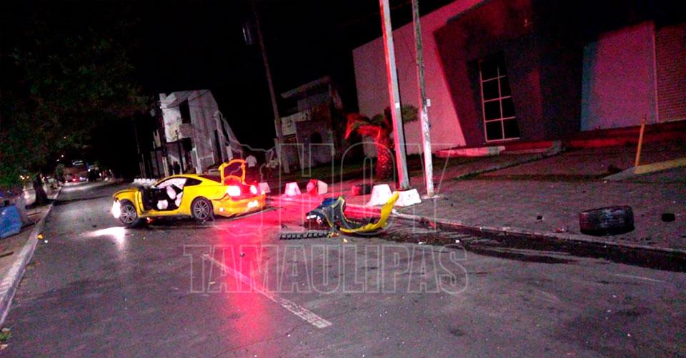 Matamoros, Tamaulipas. - Un Mustang quedó destruido tras ser chocado por su dueño que escapó del lugar donde originó los destrozos.