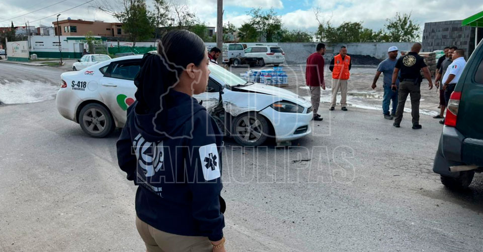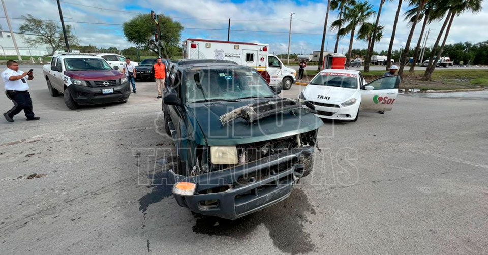 Matamoros, Tamaulipas. - Un fuerte choque ocurrió en el cruce de la avenida Cantinflas, con calle Tarahumara, donde el conductor de un taxi se voló la luz roja del semáforo, y provocó ser chocado por una camioneta recién nacionalizada con el programa federal.