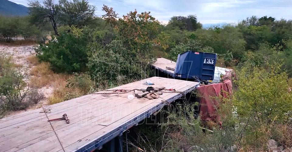 Jaumave, Tamaulipas. - Un hombre de 46 años de edad y de oficio chofer de tractocamión, resultó lesionado esta madrugada luego de perder el control de la pesada unidad y terminar volcado entre el monte en la carretera Victoria-Tula.