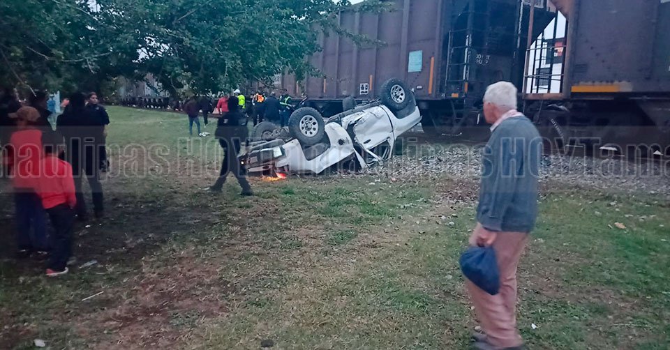 Ciudad Madero, Tamaulipas. – El conductor de una camioneta salvó la vida de forma milagrosa, cuando al tratar de ganarle el paso al tren fue embestido por la locomotora que lo proyectó a un costado, quedando su vehículo volcado.