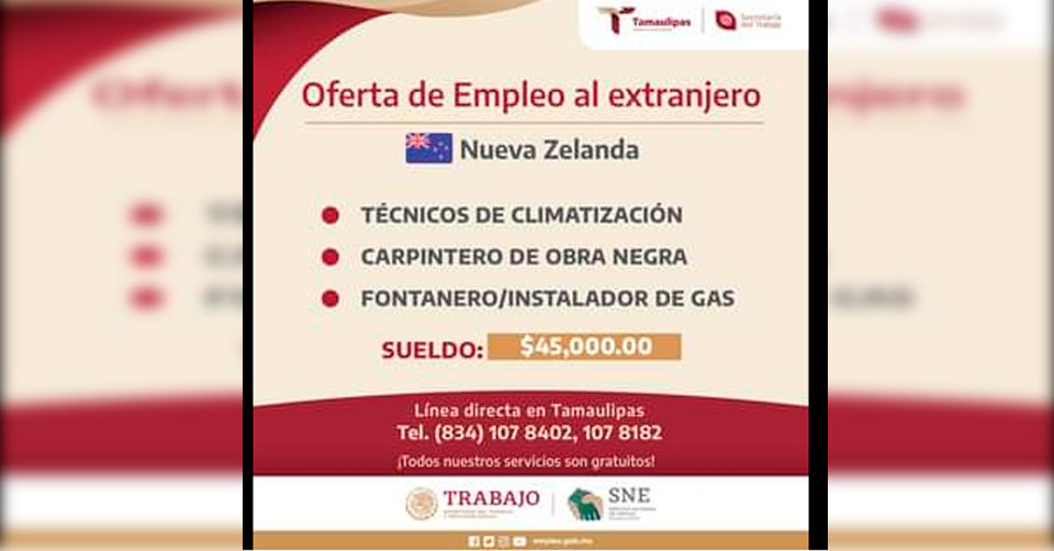 Ciudad Victoria, Tamaulipas. - El Servicio Nacional de Empleo (SNE) en Tamaulipas oferta vacante de empleo en Nueva Zelanda.