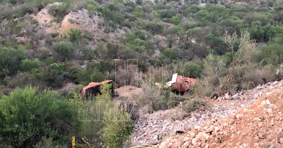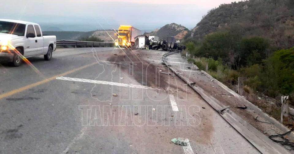 Jaumave, Tamaulipas. - El chofer de un tractocamión y su acompañante resultaron lesionados está mañana, tras volcar la pesada unidad en la que se desplazaban en el kilómetro 33 de la carretera Rumbo Nuevo.