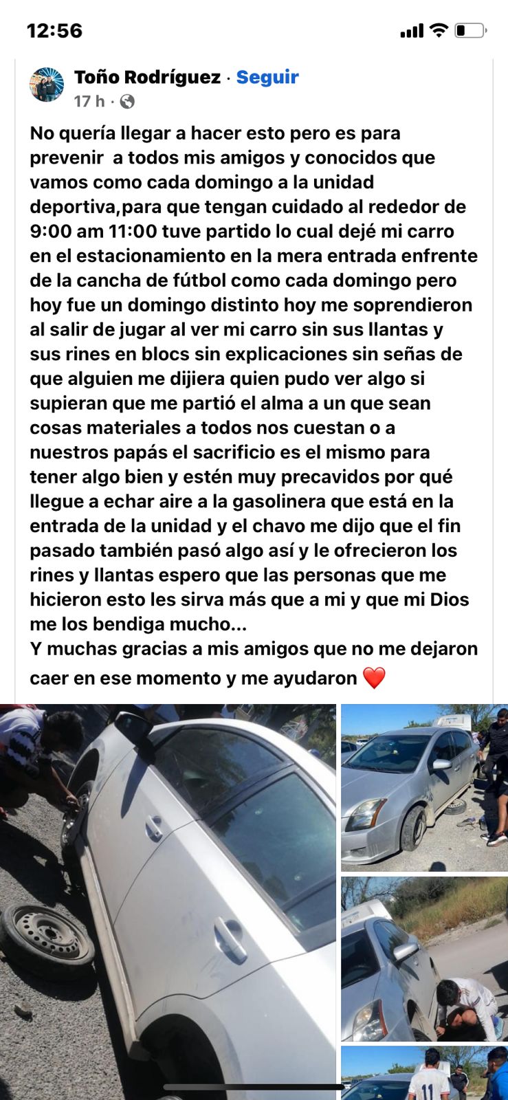 "No quería llegar a hacer esto, pero es para prevenir a todos mis amigos y conocidos que vamos como cada domingo a la unidad deportiva, para que tengan cuidado alrededor de 9:00 am 11:00 tuve partido, lo cual dejé mi carro en el estacionamiento en la mera entrada enfrente de la cancha de fútbol como cada domingo pero hoy fue un domingo distinto hoy me sorprendieron al salir de jugar al ver mi carro sin sus llantas y sus rines en blocs sin explicaciones sin señas de que alguien me dijera quien pudo ver algo", posteó.