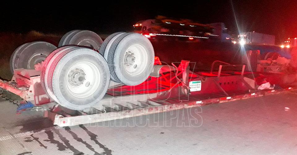 Nuevo Laredo, Tamaulipas.— Al cambiar de carril sin disminuir la velocidad en el tramo inconcluso del Libramiento Mex II en Nuevo Laredo, el operador de un tráiler con doble remolque provocó un accidente vial que, además de daños, dejó a otro chofer de tractocamión lastimado.