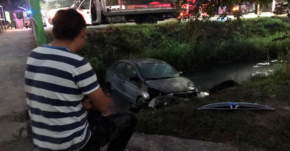 El Mante, Tamaulipas. - Un conductor en completo estado de ebriedad terminó por darse un chapuzón con todo y auto, luego de perder el control y caer a un canal en la Avenida Juan de Dios Villarreal en El Mante.