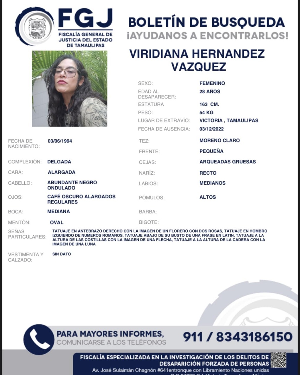 Ciudad Victoria, Tamaulipas.- La joven Viridiana Hernández Vázquez de 28 años de edad fue vista por última vez el pasado 3 de diciembre en Ciudad Victoria, por lo que sus amigos y familiares piden la ayuda de la ciudadanía para localizarla.