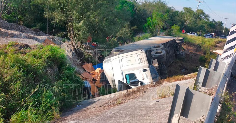 San Fernando, Tamaulipas. – Cientos de lugareños rapiñaron miles de piernas de cerdo luego de que un tráiler volcó esta tarde en el kilómetro 020+200 de la carretera federal Entronque Urracas-Reynosa, a la altura del puente "El Muñeco" del municipio de San Fernando.