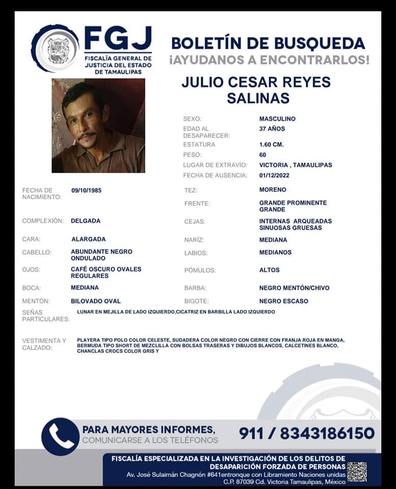 Ciudad Victoria, Tamaulipas. - La Fiscalía General de Justicia de Tamaulipas emitió una ficha de búsqueda para dar con el paradero de Julio César Reyes Salinas.