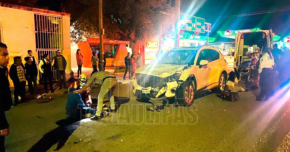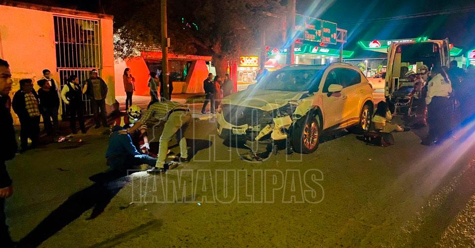 El accidente se registró cuando el conductor de una camioneta Mazda blanca circulaba en dirección de sur a norte por la calle 8, al llegar a la calle Carrera presuntamente omitió la luz roja del semáforo.