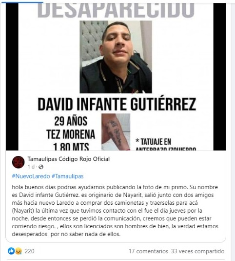 Según información de sus familiares, David de 29 años de edad se dirigió de Nayarit, de donde es originario, hacia la frontera de Nuevo Laredo en busca de comprar dos camionetas.