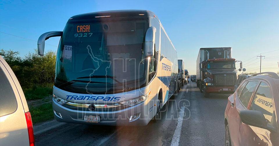 Cabe mencionar que entre la larga fila hay autobuses de la línea Transpaís, ADO y entre otros que van con dirección a Matamoros y Reynosa, pero no pueden avanzar debido al accidente.