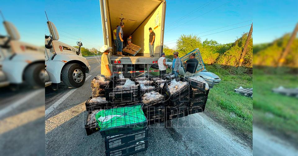 En el sitio están elementos de la Guardia Nacional tomando conocimiento y habitantes del Ejido Francisco Villa, quienes están apoyando para recoger la fruta y verdura que llevaba una de las cajas de tráileres que acabó volcada, transportándola a otra caja.