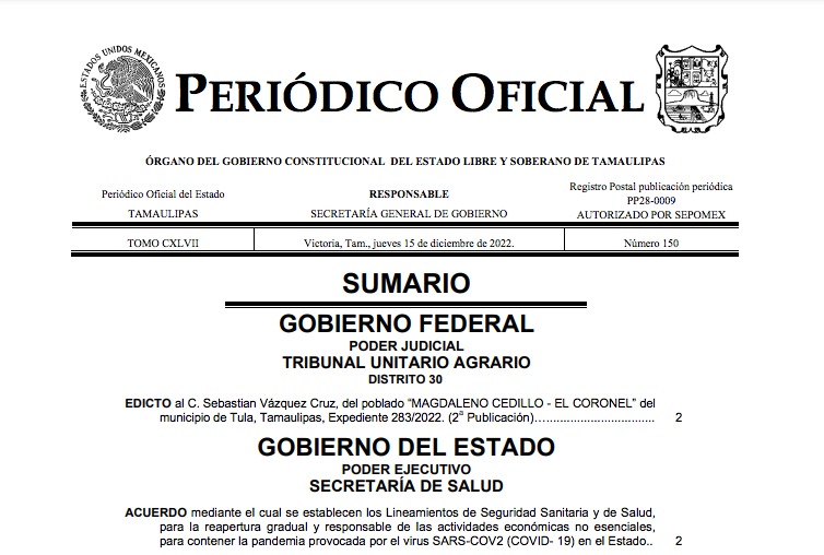 Ciudad Victoria, Tamaulipas. - La Secretaría de Salud en Tamaulipas publicó en el Periódico Oficial del Estado el acuerdo mediante el cual se establecen los Lineamientos de Seguridad Sanitaria y de Salud, para la reapertura gradual y responsable de las actividades económicas no esenciales, para contener la pandemia provocada por el virus SARS-COV2 (COVID- 19) en la entidad.
