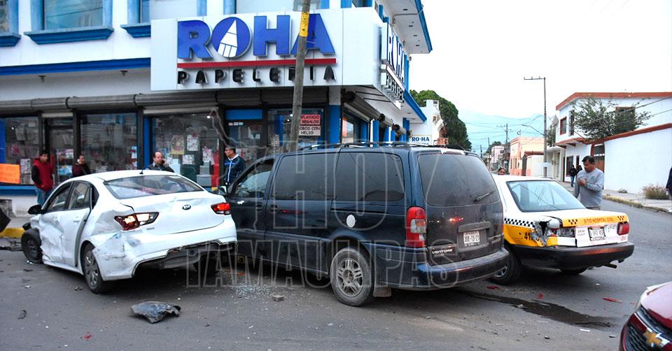 El percance ocurrió cuando la conductora de una camioneta Venture de la Chevrolet que viajaba con su hijo no hizo el alto correspondiente al llegar al 9 Bravo y terminó impactando al Taxi y un automóvil Kia que se desplazaban de norte a sur.
