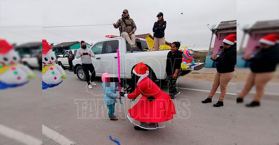 Los elementos acudieron al sector de la Playa Bagdad donde realizaron esta noble acción con los menores de la zona, pasando un momento agradable con los niños, y es que además de darle el regalo navideño también quebraron piñatas.
